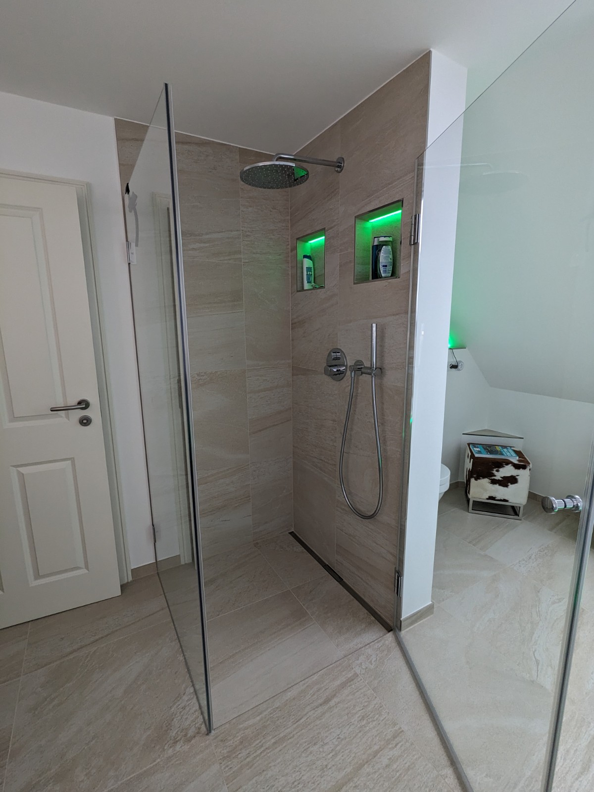 Exklusiver Badumbau in Kiel Eine hochwertiger Wohlfühlraum mit großer Badewanne, ebenerdiger Dusche, geräumiger Waschtisch-Möbelanlage und toller Beleuchtung.